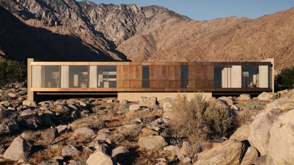 The Woods House at 2212 Winter Sun is situated amongst the foothills of the San Jacinto Mountains overlooking Palm Springs. A bold take on elemental, contemporary design by Woods + Dangaran, the 3,310-square-foot home is surrounded by boulders and spans a natural arroyo. Though lifted above existing site features, The Woods House still retains a powerful connection to the earth, with floor-to-ceiling windows that frame stunning views of the desert in all directions. Inside, neutral-toned interiors are layered with texture, including earth-tone plaster, concrete, exposed brick, and an assemblage of wooden furniture, all of which mirror the natural surroundings.