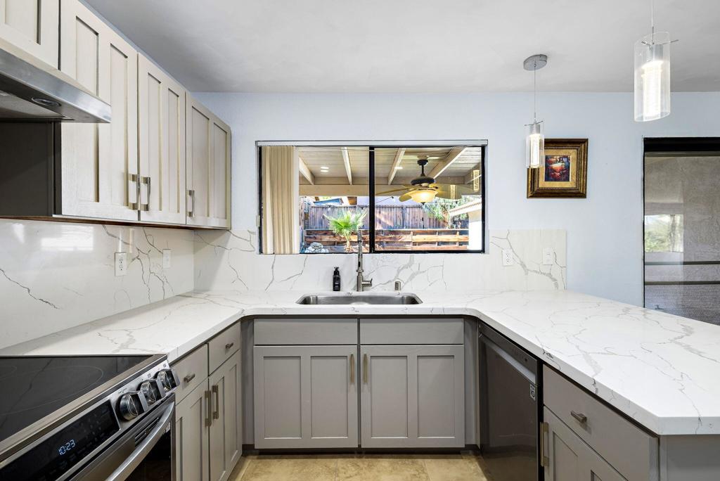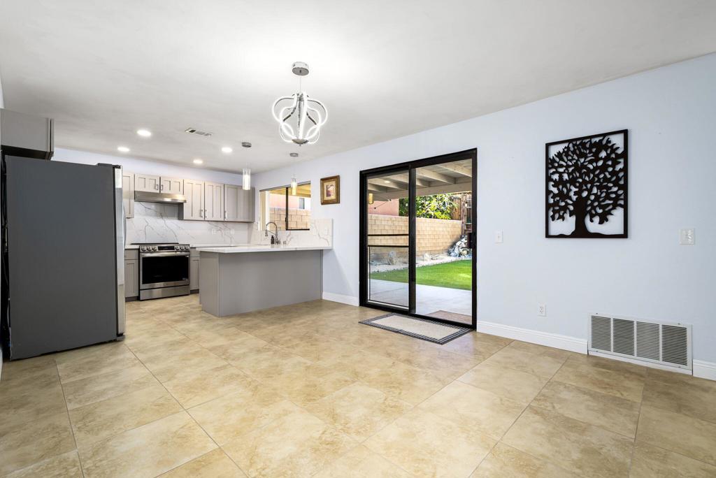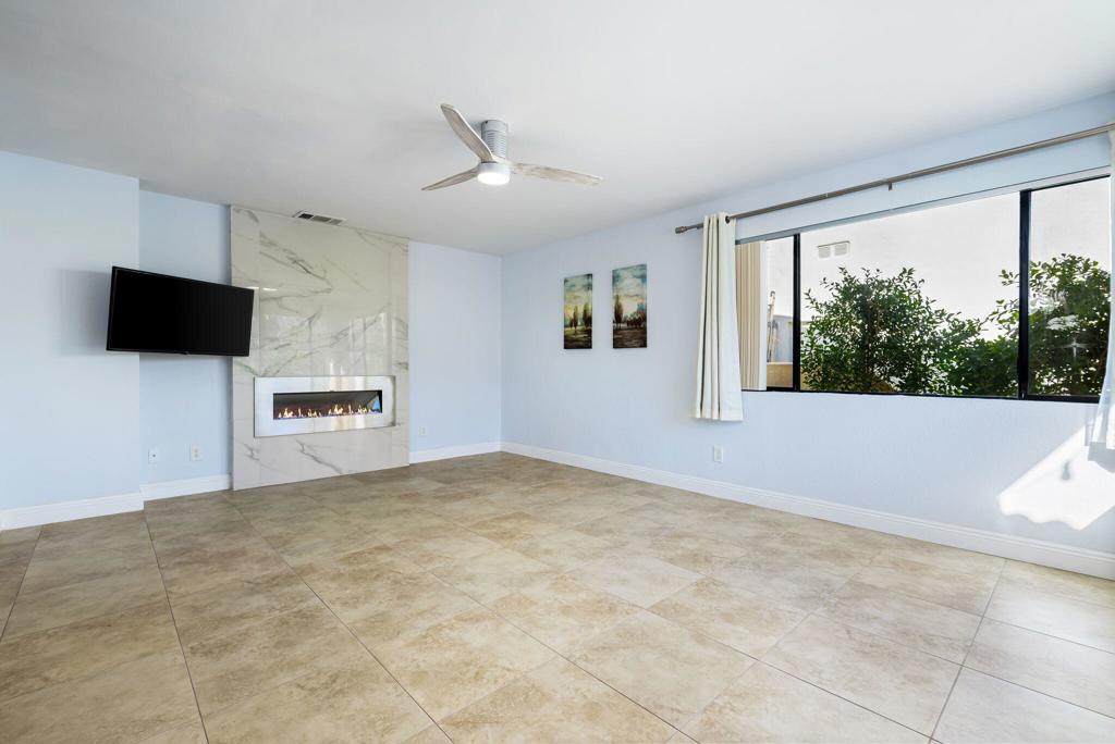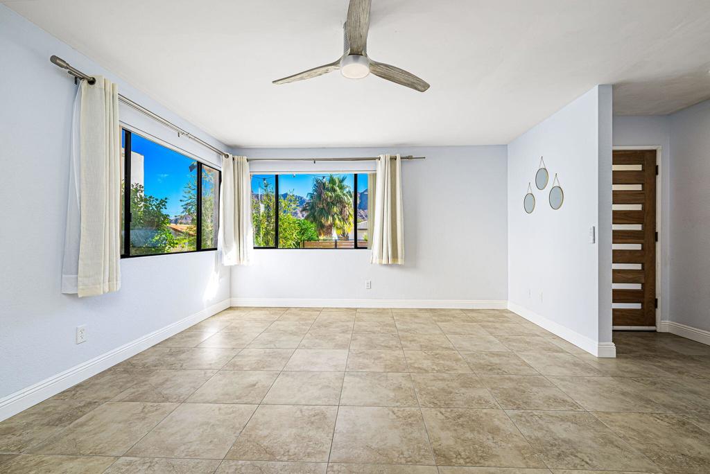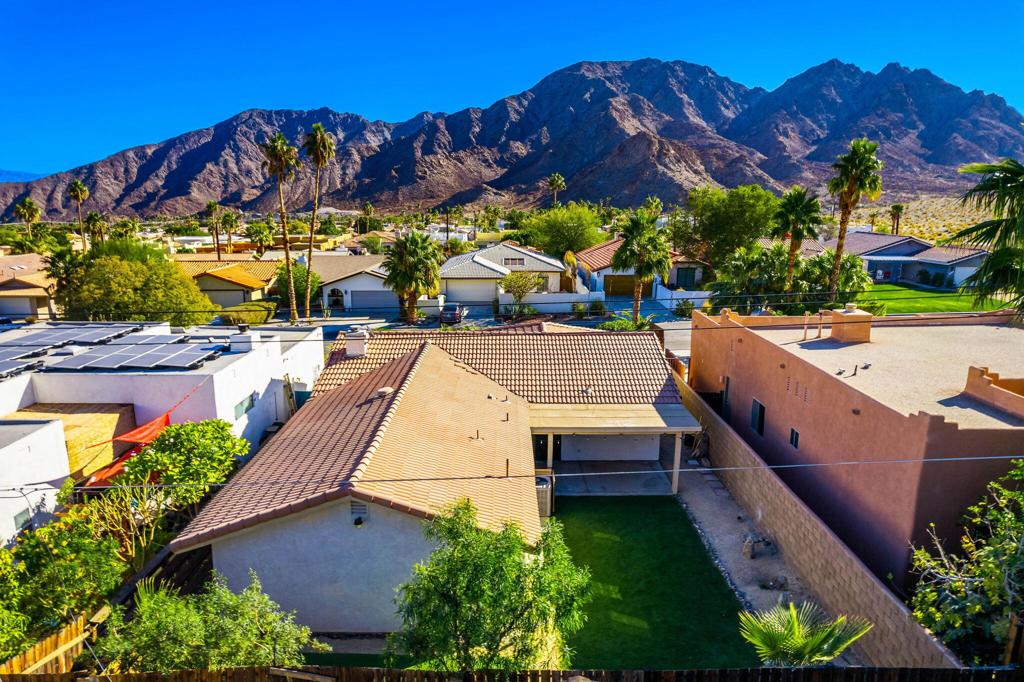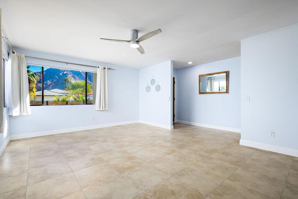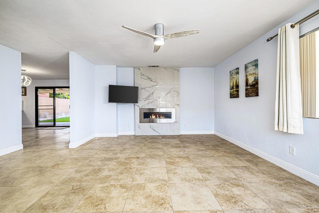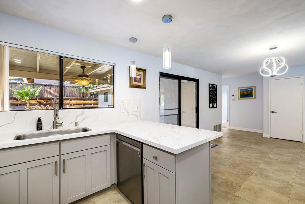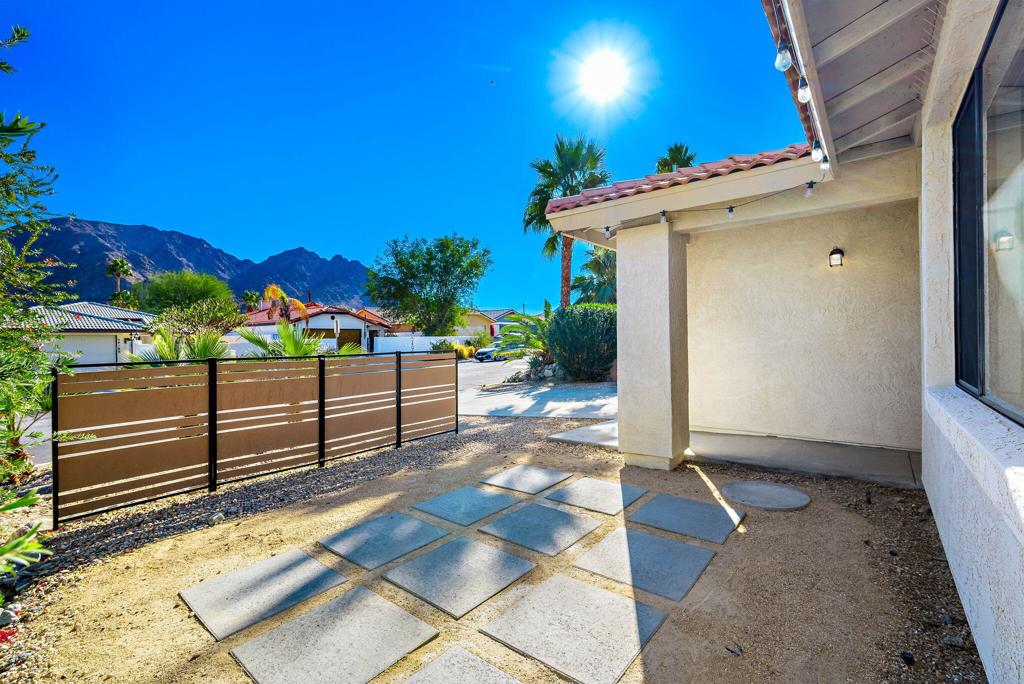 LEASE AVAILABLE IMMEDIATELY! (1 year minimum). Updated home in upper La Quinta Cove with beautiful mountain views...4 homes from the top! This 3 bedroom/2 bathroom home has an open floor plan that features a living room with new electric fireplace and wall-mounted flatscreen TV, and a dining area off the kitchen. Freshly updated with new neutral tile (carpet in bedrooms), quartz countertops, contemporary ceiling fans, vessel/bowl bathroom sinks, new showers and more! Access to the patio off of the kitchen/dining area. The backyard is enclosed/fenced for your privacy (good for pets!) and includes your personal putting green. Primary bedroom is en suite with a new shower and sinks...and has access to the backyard. There are two guest rooms sharing a guest bathroom with tub & shower. Attached 2-car garage has direct access to the home. Great proximity to shopping & dining in Old Town La Quinta and all the great hiking trails this area has to offer! Home is unfurnished. Appliances included are: kitchen refrigerator, stove, dishwasher, countertop microwave, and washer & dryer. There is electric only in home, no gas or propane. Tenant pays all utilities - water, electric and cable/internet. Landlord pays gardener.